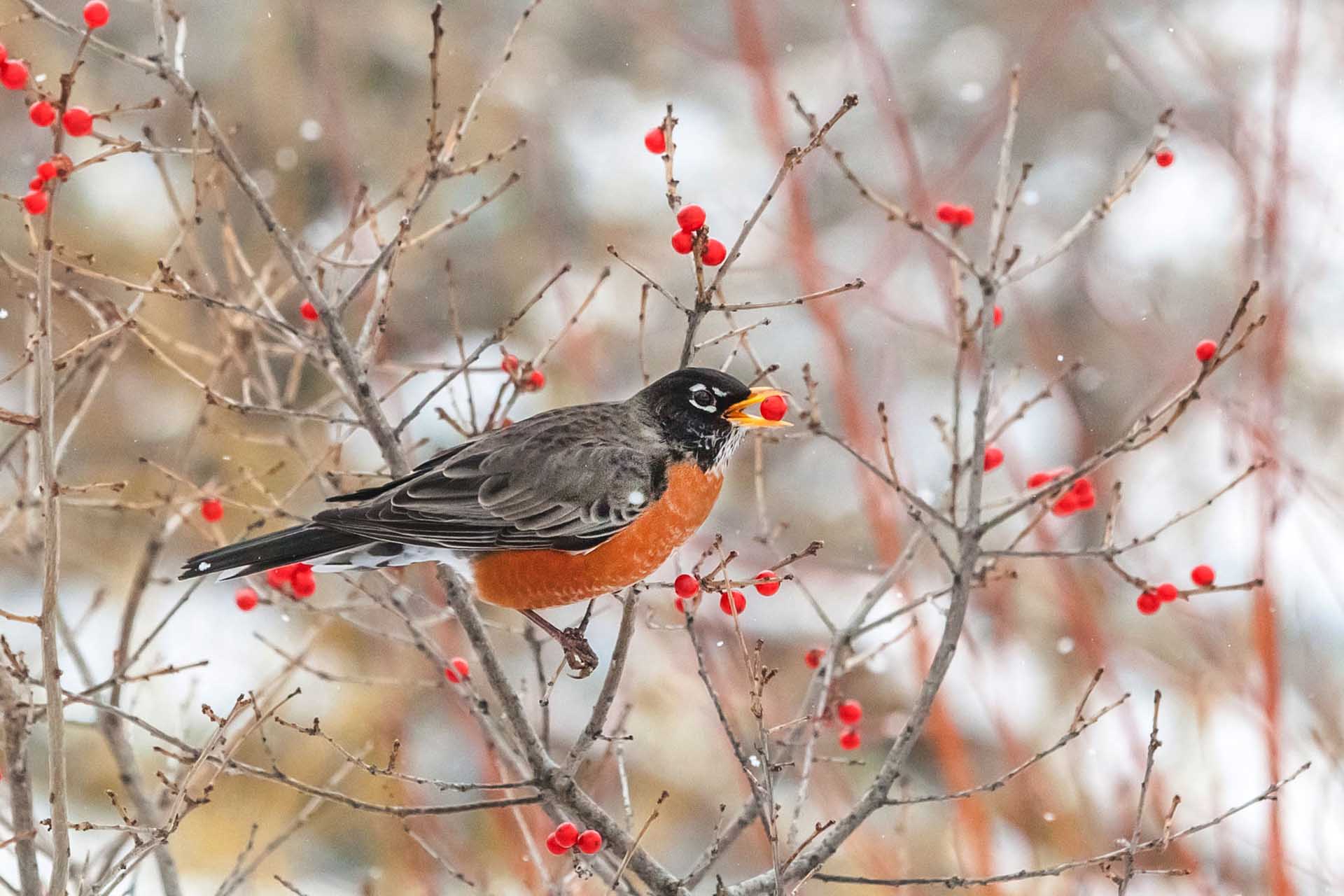 The American Robin is often associated with spring, its appearance generally regarded as the classic “first sign of spring” in the garden – especially when it’s spotted hopping along in search of earthworms. Warmer days are surely near when robins begin to migrate north. But did you know that many robins are year-round residents, calling Northeast Ohio home all winter long?