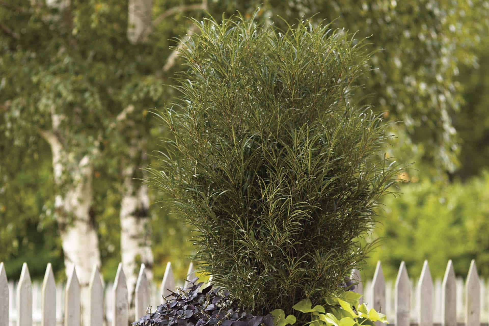 A glossy leaf, upright to narrow columnar shrub that is easy to grow and commonly used as a hedge or natural screen with excellent cold hardiness. Dark green leaves turn golden in the fall along with maturing red to black inedible fruit that the birds do enjoy. Very narrow habits and fern-leaf varieties are available that make excellent container garden “thrillers”.