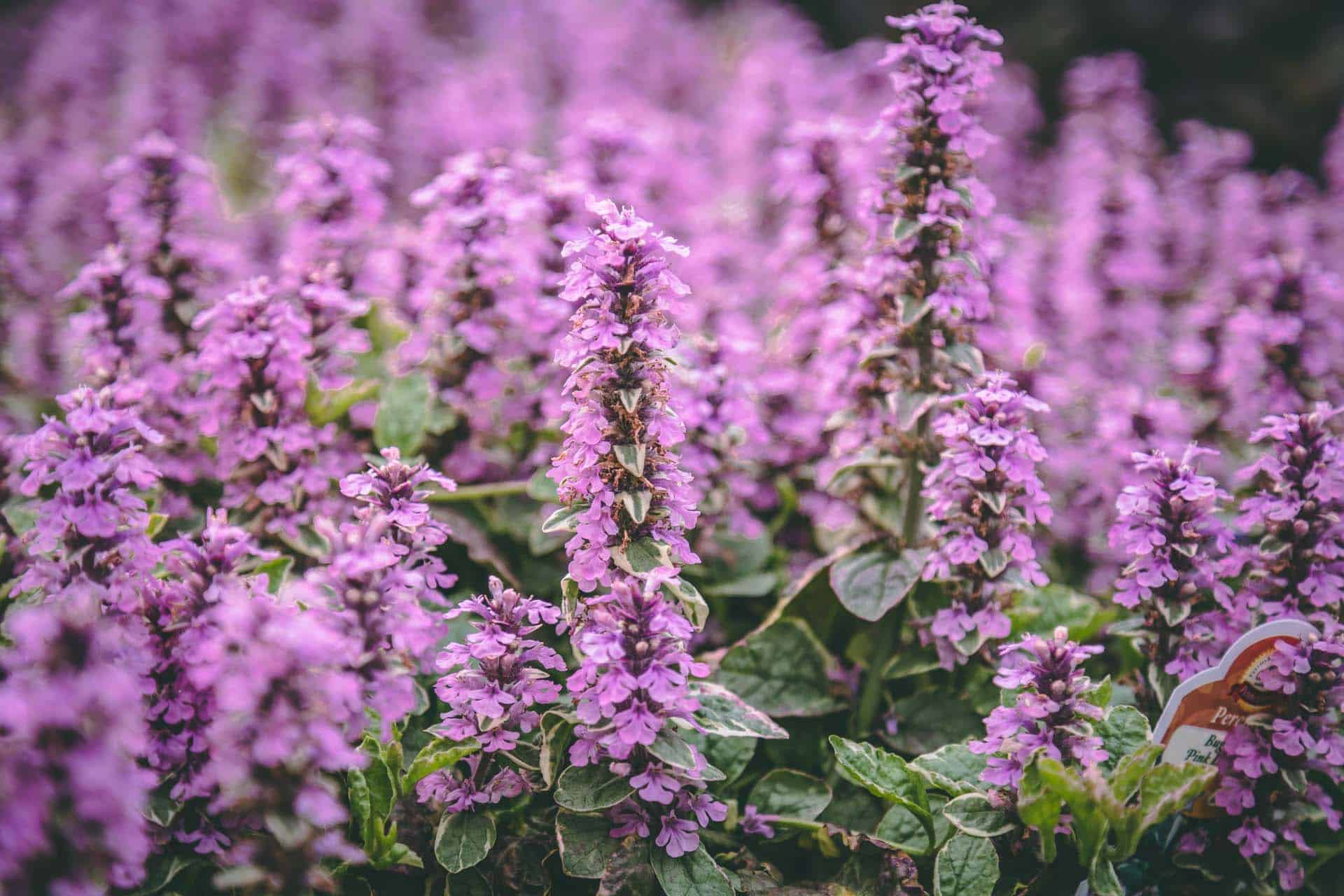 An outstanding groundcover with robust colored foliage in dark purple, bronze or changes from deep green, light green, rose, violet and burgundy with mottled edges of creamy-white. A moderate to fast growing groundcover in good soil, best in a 1/2 day of sun to part shade. 2″ tall, violet-blue spikes cover the plants in spring and develop sporadically the rest of the season. Grow anywhere you need a tough, attractive groundcover.