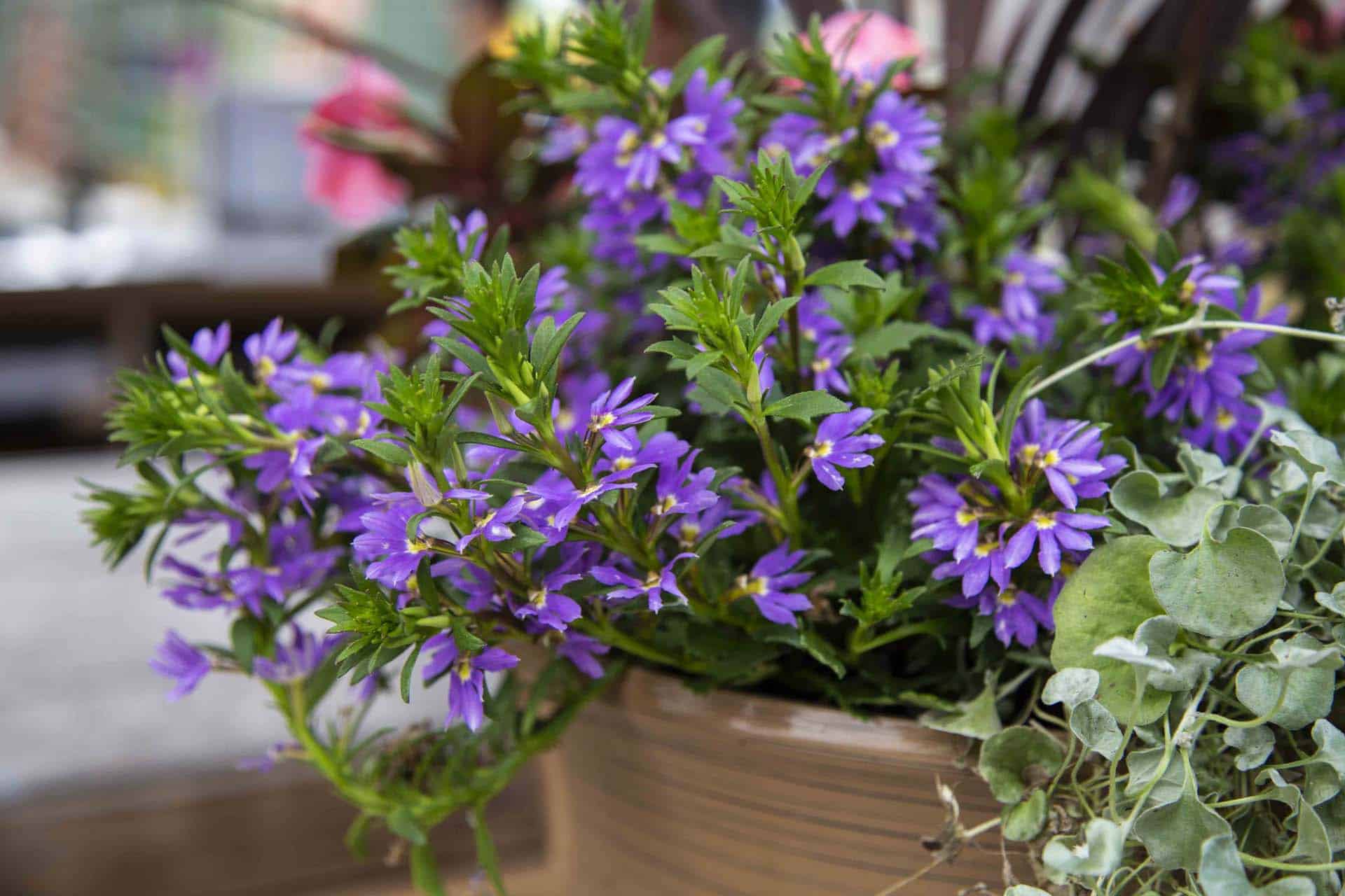 Petite, fan-shaped flowers in periwinkle blue, pale pink and white with a yellow eye that are prolific bloomers in summer heat over a well branched, spreading/trailing, semi-succulent habit that is also self-cleaning. Scaevola are wonderful heat and drought tolerant plants that can be used as annual groundcovers in the landscape or as “spillers” in sunny, mixed container gardens.