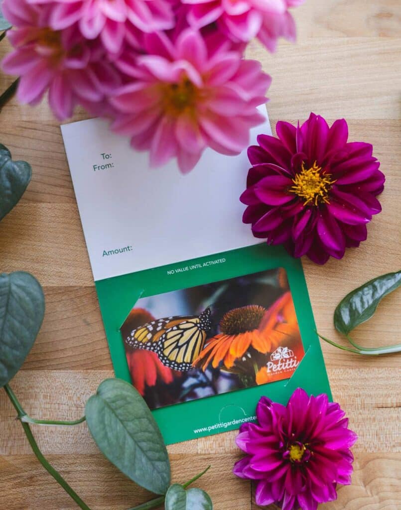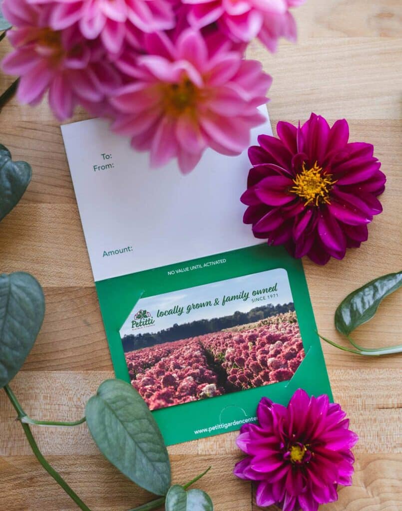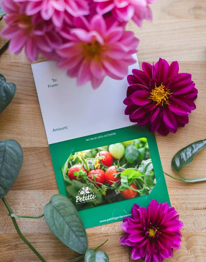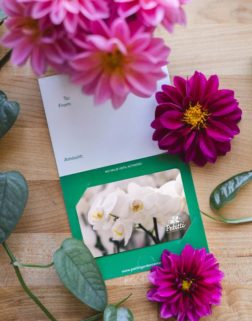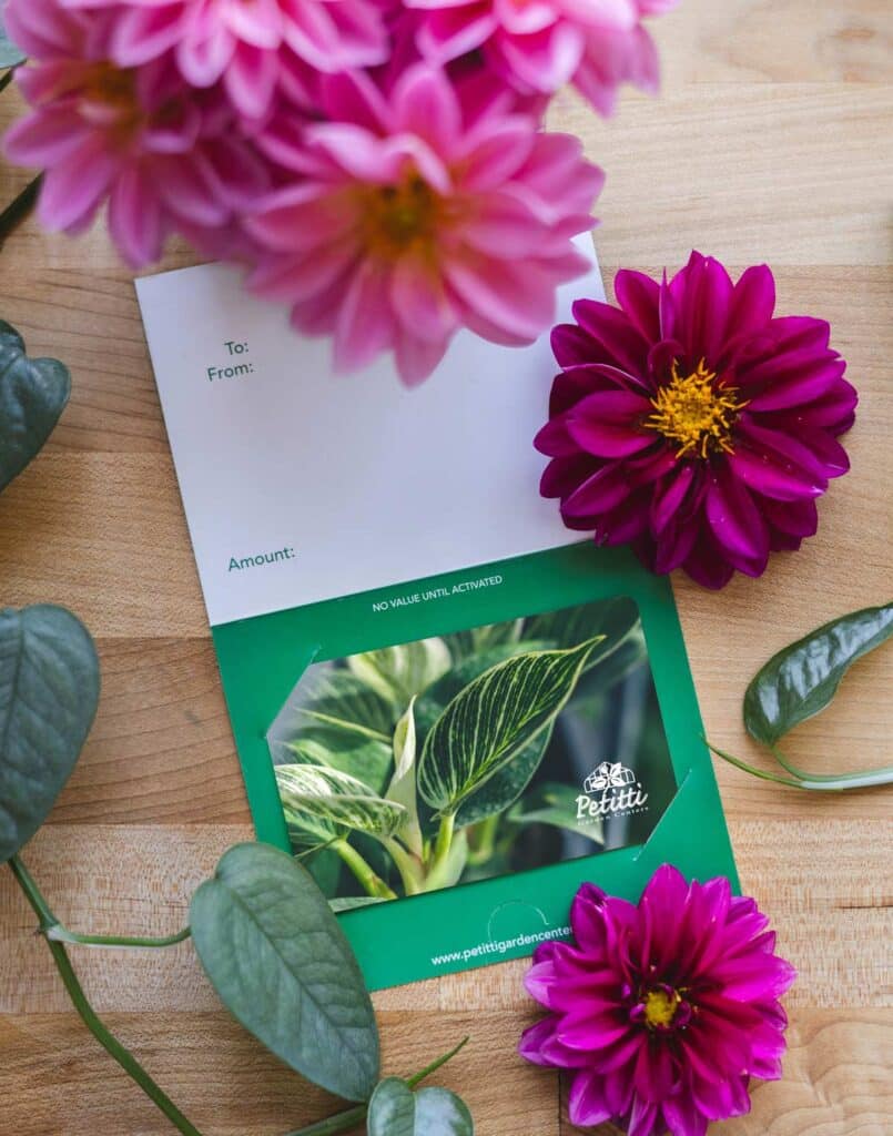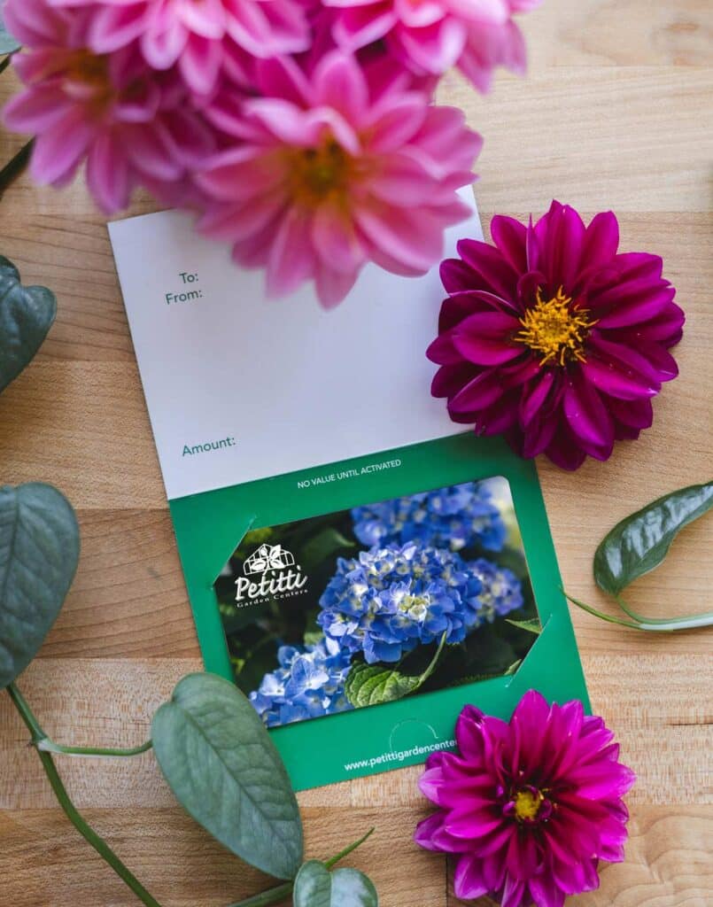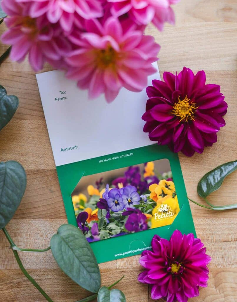 Petitti Gift Cards are redeemable year-round for plants, supplies, home décor, and so much more. No activation fees, and funds never expire. Shop physical gift cards in stores, buy e-gift cards online, and order physical gift cards to arrive by mail.