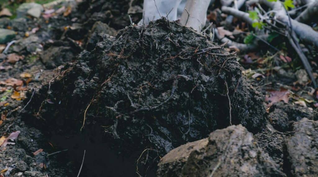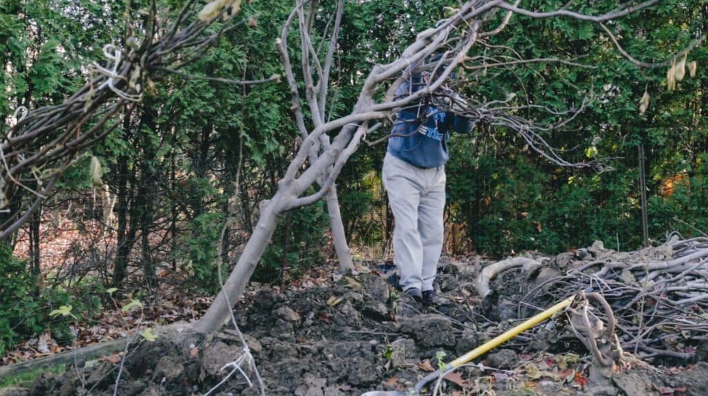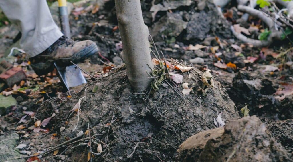 - Dig around the root ball, such that the tree is loosened and the trunk can be fully tipped over and laid onto the ground.